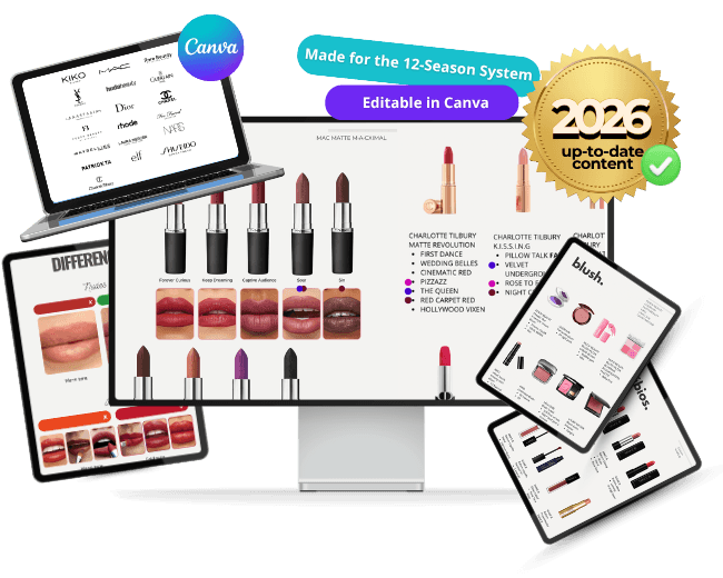 ➡️ You get access to over 1,000 makeup products organized by color palettes, ready to use with your clients. This includes lipsticks, eyeshadows, blush, contour, foundation, and highlighter.